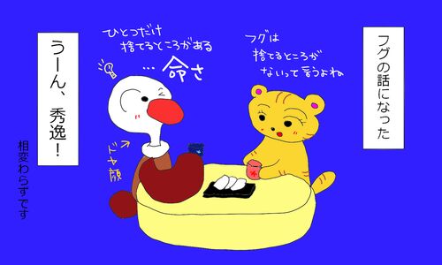 テレビかなんか見てた時の会話。 「フグは(内臓とかも余すところなく食べられて)捨てるところがないって言うよね」 「!(何か思いついたらしい)…そんなフグも、ひとつだけ捨てるところがあるんだ」 「どこ?」 「(たっぷりためて)…命さ」 わたしの目が…